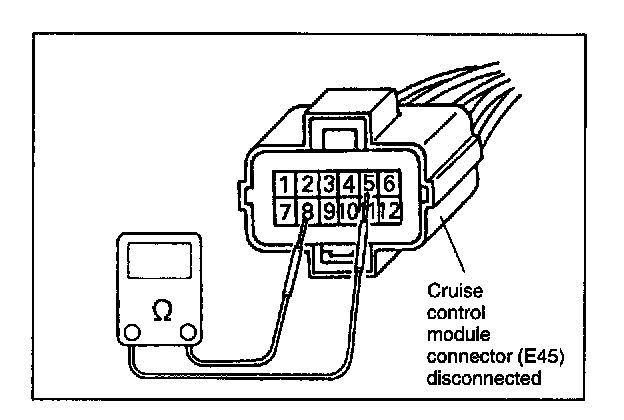 CAUTION: Cruise control module can not be checked by itself. It is strictly prohibited to connect voltmeter or ohmmeter to cruise control module with coupler disconnected from it.
