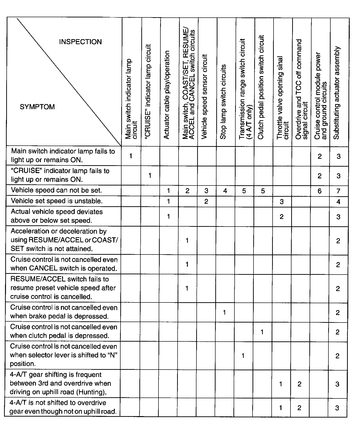 Perform troubleshooting for each problem symptom, checking circuits involved in each symptom in the order given in the table.