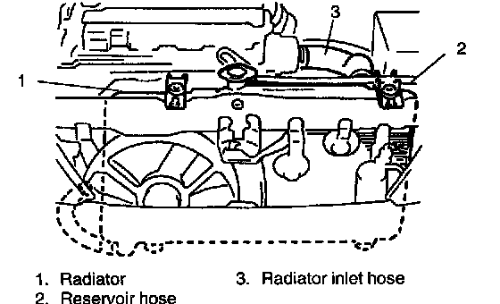 4. Disconnect radiator inlet and outlet hoses and reservoir tank hose from radiator.