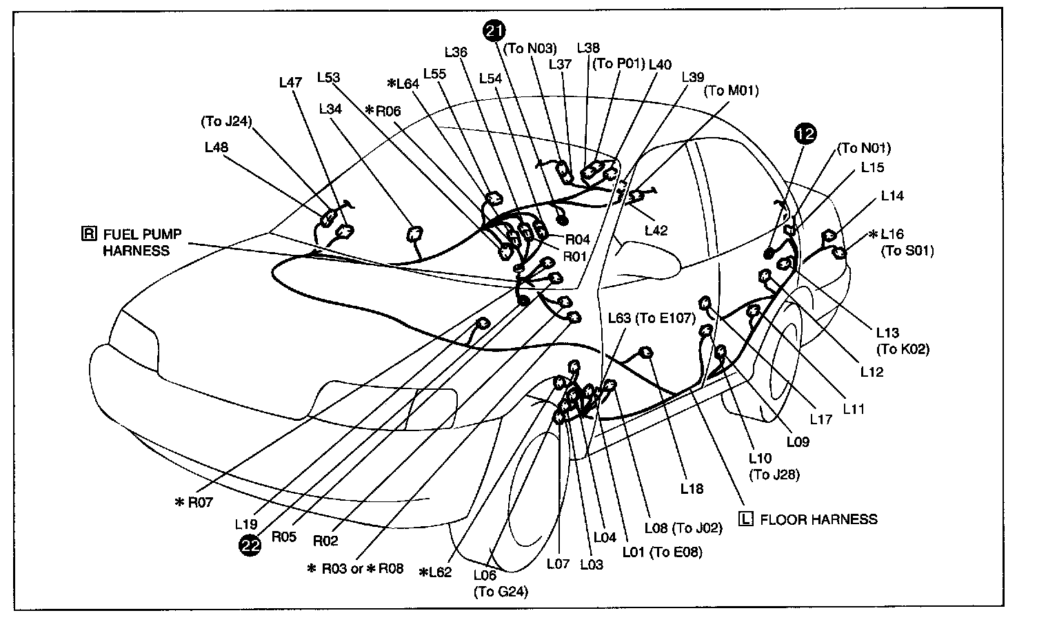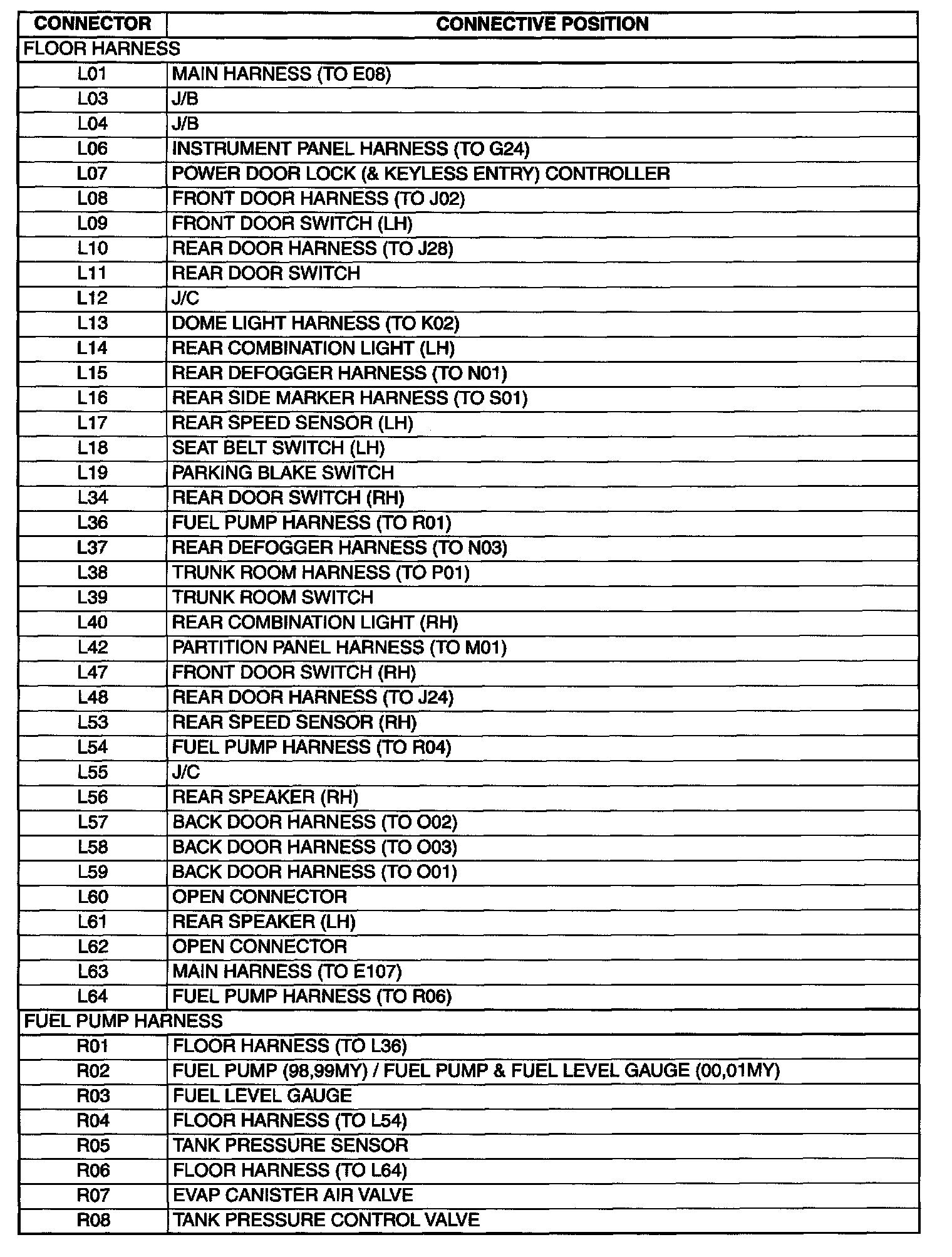 L: Floor Harness, R: Fuel Pump Harness (For Sedan), L: Floor Harness, R: Fuel Pump Harness (For Wagon) Connectors: