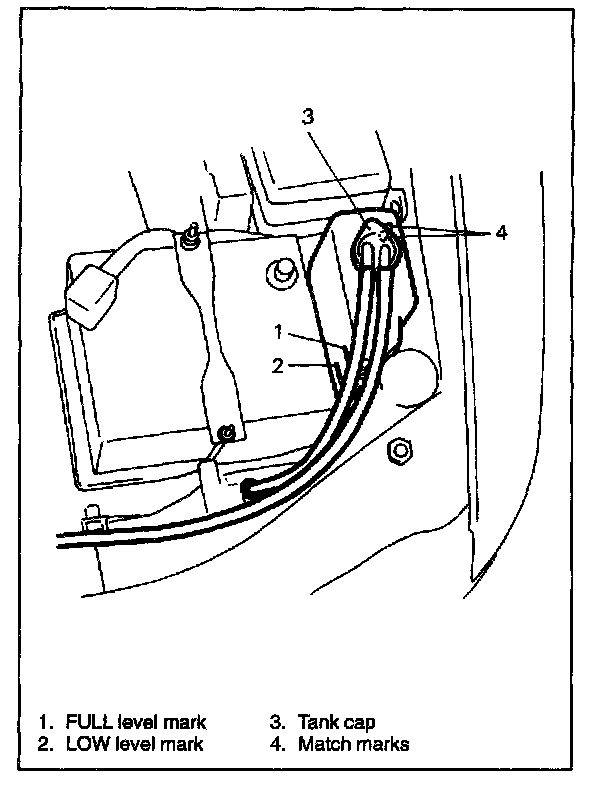 6. Add coolant to reservoir tank so that its level aligns with Full mark. Then, reinstall cap to reservoir tank aligning match marks on the tank and cap.