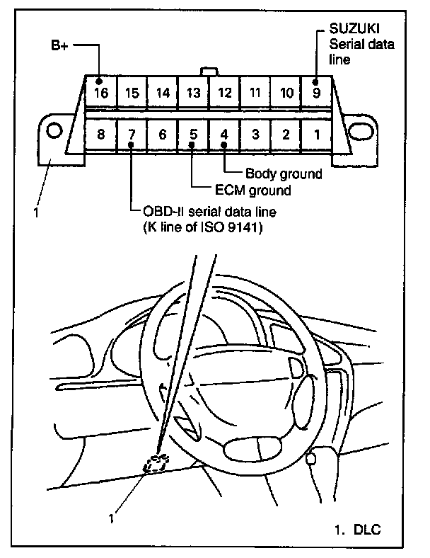 OBD-II serial data line (K line of ISO 9141) is used for SUZUKI scan tool or OBD-II generic scan tool to communicate with ECM. SUZUKI serial data line is used for SUZUKI scan tool to communicate with an electronic control unit other than ECM (Airbag SDM, ABS control module, etc.).