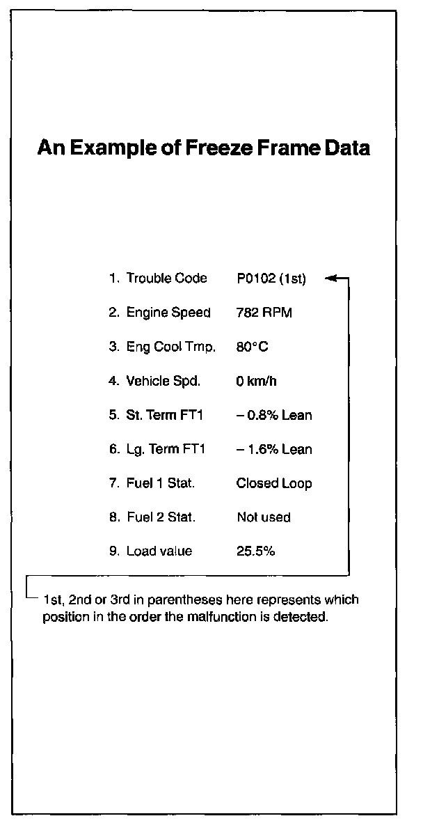 Therefore, it is possible to know engine and driving conditions (e.g., whether the engine was warm or not, where the vehicle was running or stopped, where air/fuel mixture was lean or rich) when a malfunction was detected by checking the freeze frame data. Also, ECM has a function to store each freeze frame data for three different malfunctions in the order as the malfunction is detected. Utilizing this function, it is possible to know the order of malfunctions that have been detected. Its use is helpful when rechecking or diagnosing a trouble.