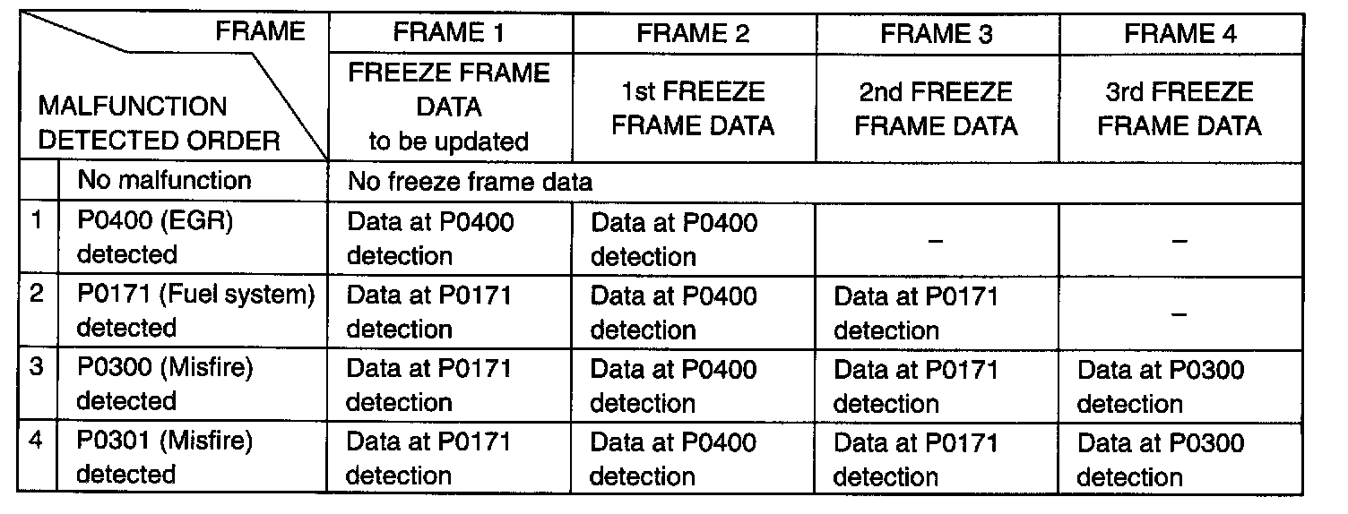 Shown in the table are examples of how freeze frame data are stored when two or more malfunctions are detected.