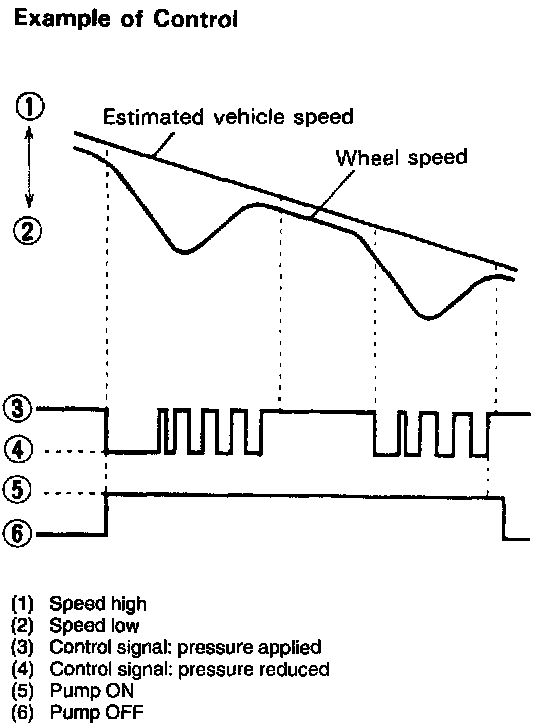 ABS control module monitors the speed of each of 4 wheels, deceleration speed of each of 4 wheels and the vehicle deceleration speed through signals from 4 wheel speed sensors and outputs control signal to each solenoid valve of the hydraulic unit to prevent it from getting locked. Also, it operates the pump motor all the time while the anti-lock control function is working.