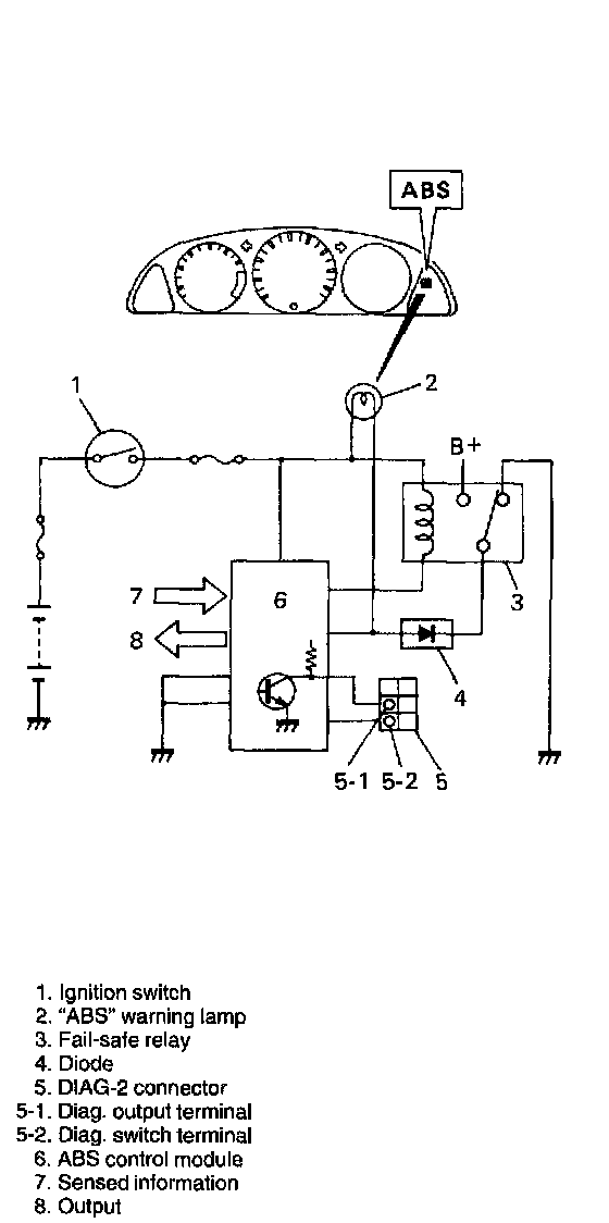 ABS control module diagnoses conditions of the system component parts (whether or not there is any abnormality) all the time and indicates the results (warning of abnormality occurrence and DTC) through the "ABS" warning lamp and outputs it through the Diag. output terminal as described below.
