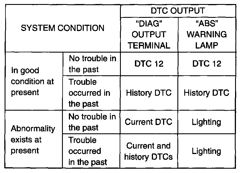 5. When Diag. switch terminal of DIAG-2 connector (monitor connector) is grounded, the abnormal area is output as DTC from Diag. output terminal. When DTC output is normal DTC 12 or history DTC only, it is also indicated by flashing of "ABS" warning lamp. (Refer to the table.)