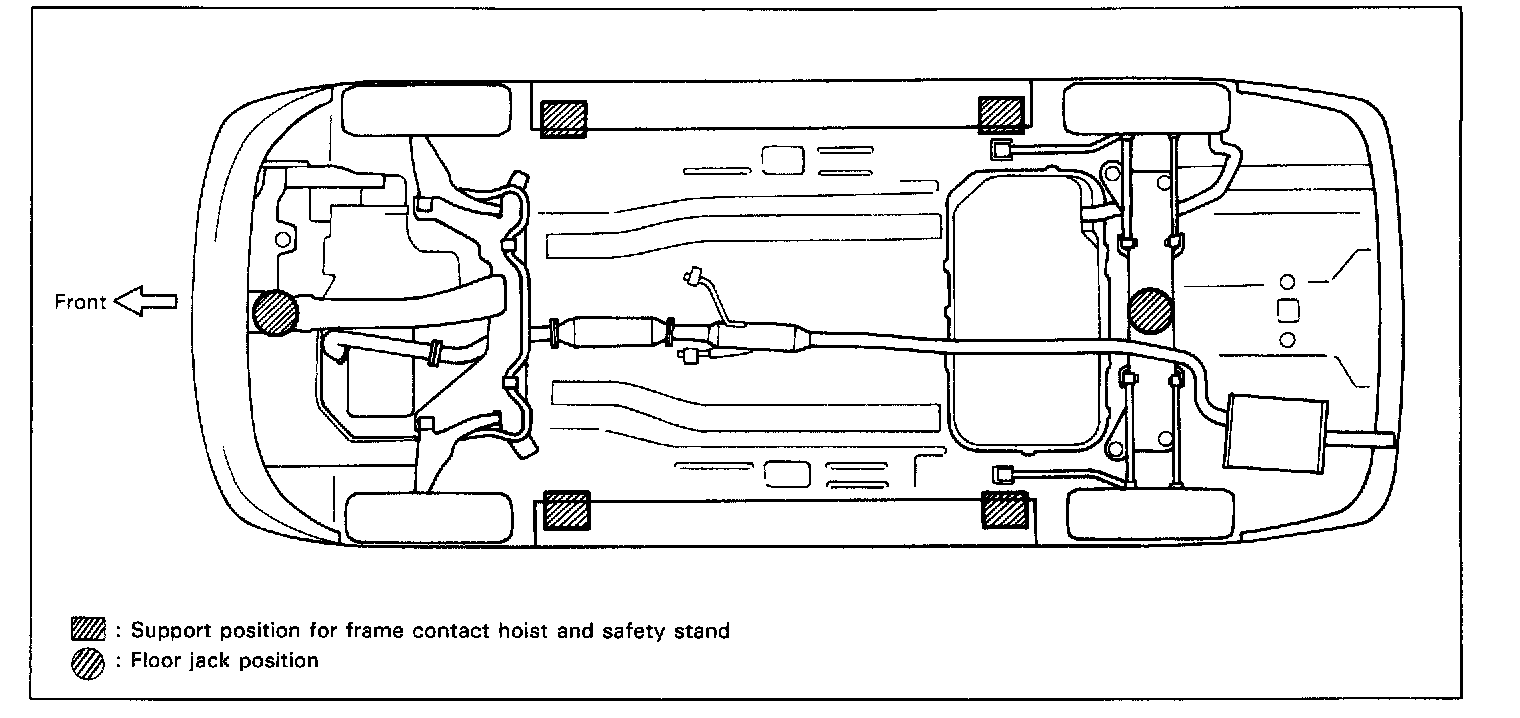 To perform service with either front or rear vehicle end jacked up, be sure to place safety stands under body so that body is securely supported. And then check to ensure that body does not slide on safety stands and the vehicle is held stable for safety's sake.