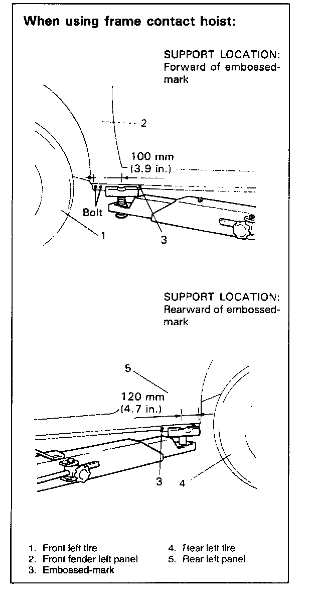- When using frame contact hoist, apply hoist as shown in figure. Lift up the vehicle till 4 tires are a little off the ground and make sure that the vehicle will not fall off by trying to move vehicle body in both ways. Work can be started only after this confirmation.