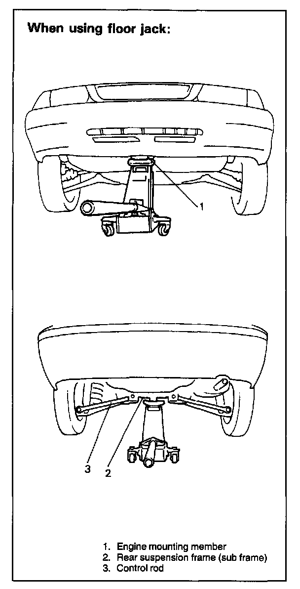 In raising front or rear vehicle end off the floor by jacking, be sure to put the jack against the front end of the engine mounting member or rear suspension frame.