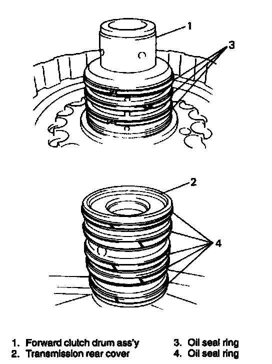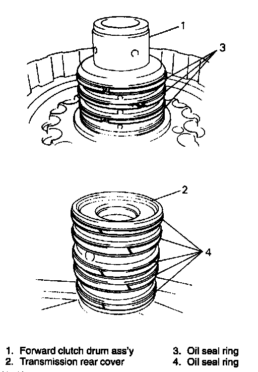 7. Remove clutch drum oil seal rings of forward clutch drum subassembly and transmission rear cover.