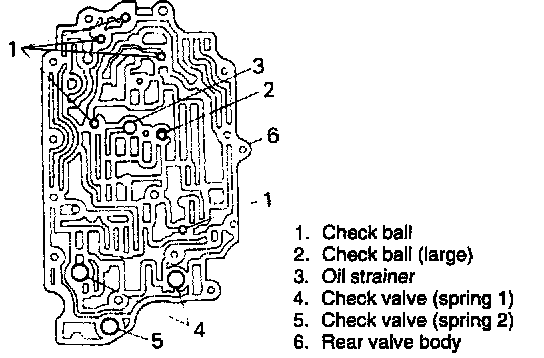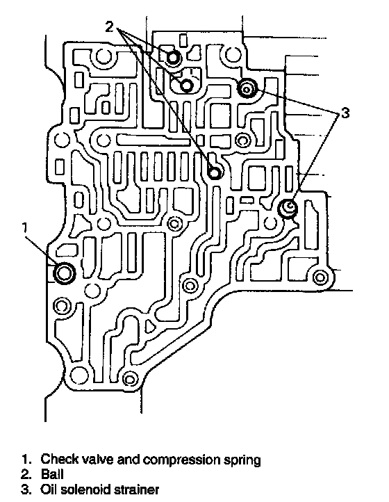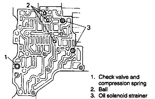 7. Remove six balls, oil solenoid strainer and check valves and compression springs.