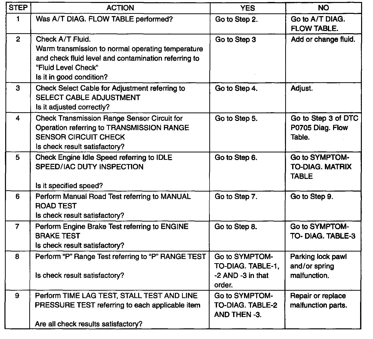 TCM and ECM has detected no malfunction DTC and no abnormality has been found in visual inspection. Follow the flow table carefully.