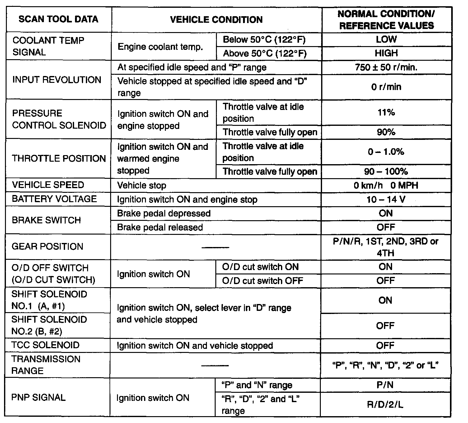 SCAN TOOL DATAAs the data values given below are standard values estimated on the basis of values obtained from the normally operating vehicles using a scan tool, use them as reference values. Even when the vehicle is in good condition, there may be cases where the checked value does not fall within each specified data range. Therefore, judgment as abnormal should not be made by checking with these data alone.