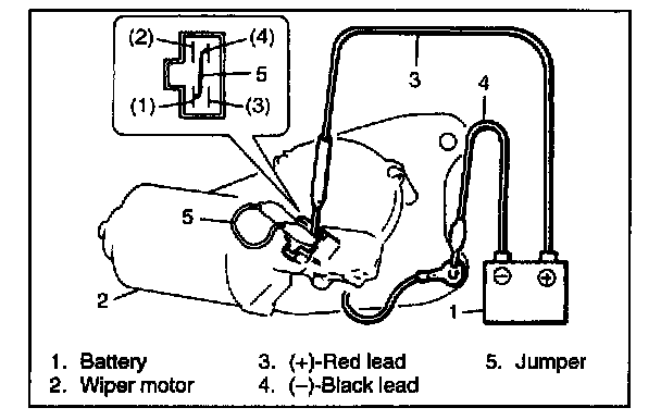 WIND SHIELD WIPER MOTOR1. As illustrated, use a 12 V battery to connect its (+) terminal to (1) terminal, and its (-) terminal to Black lead cord. If motor rotates at a low revolution speed of 47 to 57 rpm, it is proper. As for high speed check, connect battery (+) terminal to 2. terminal, and its (-) terminal to Black lead cord. If motor rotates at a high revolution speed of 70 to 84 rpm, it is proper.