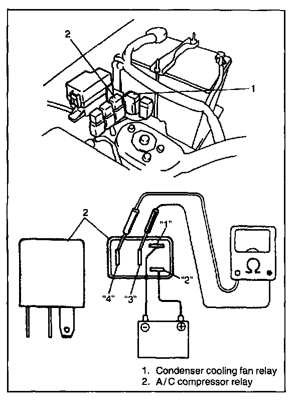 3. Connect battery positive (+) terminal to terminal "2" of relay. Connect battery negative (-) terminal to terminal "1" of relay. Check continuity between terminal "3" and "4".