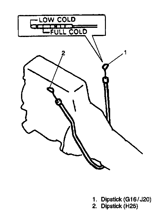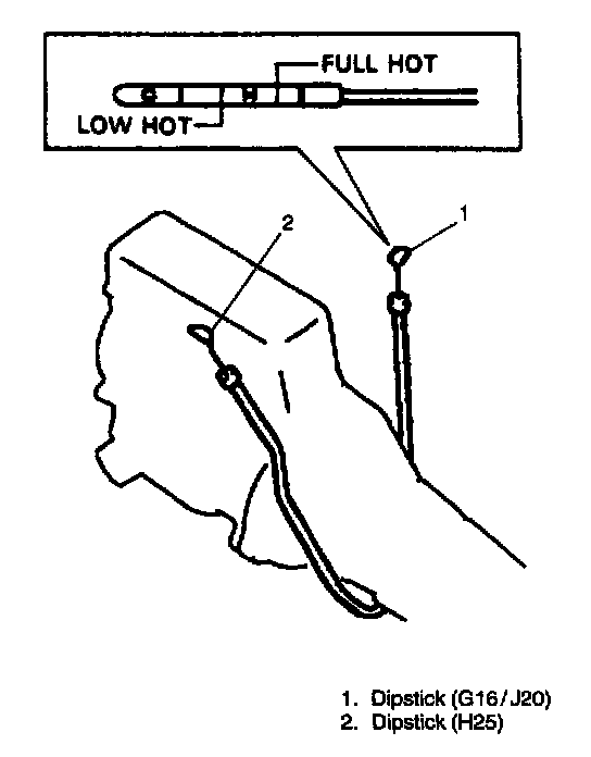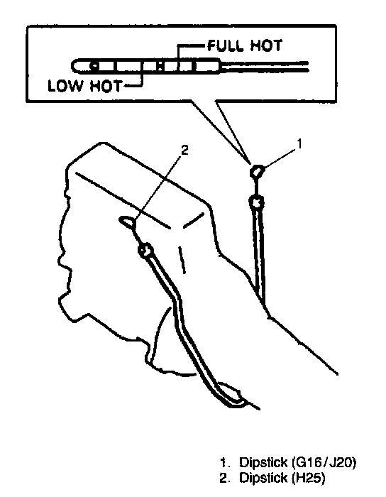 7. Pull out dipstick again and check fluid level indicated on it. Fluid level should be between FULL HOT and LOW HOT. if it is below LOW HOT, add an equivalent of DEXRON(R)-III up to FULL HOT.