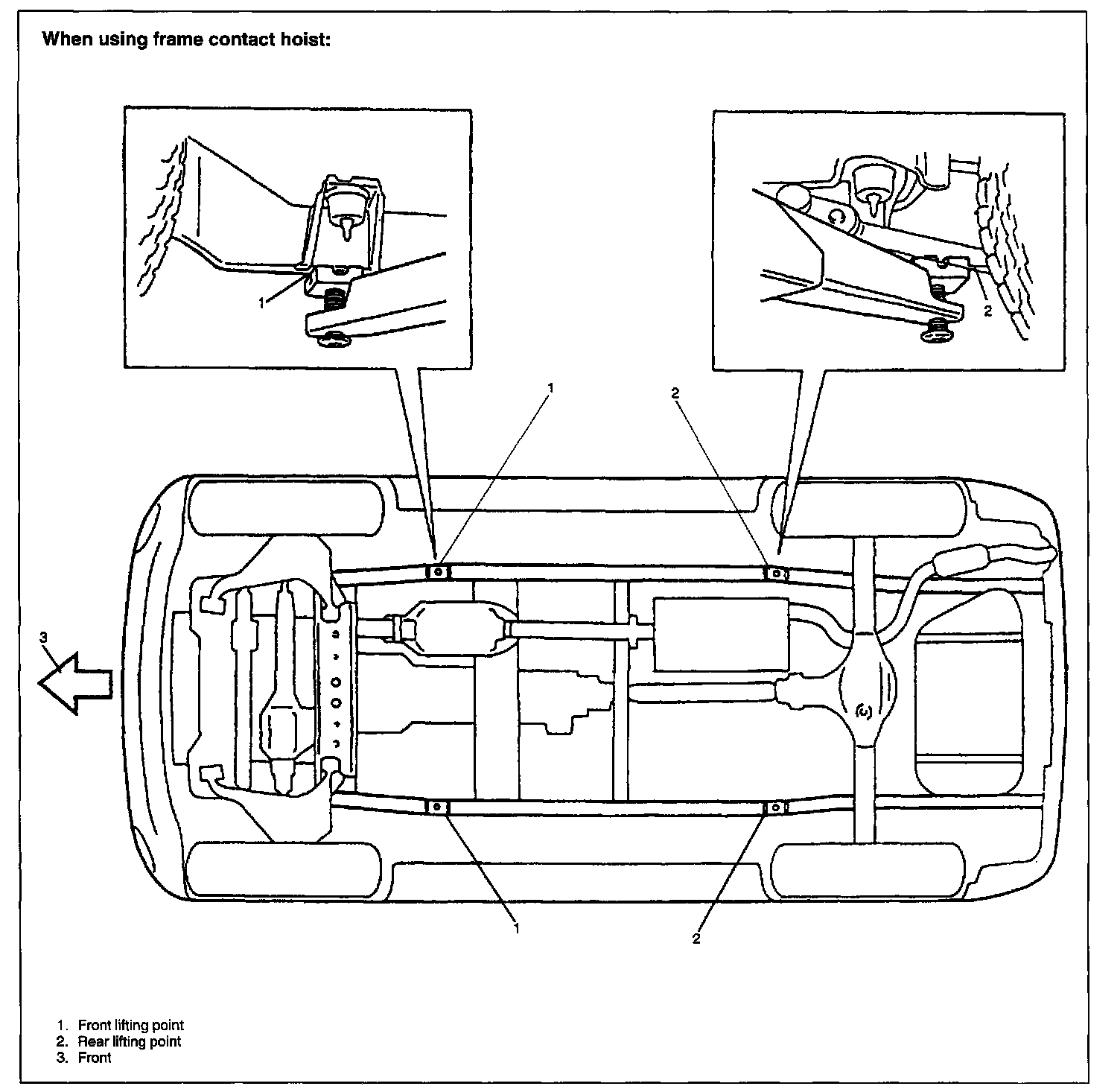- Before applying hoist to underbody, always take vehicle balance throughout service into consideration. Vehicle balance on hoist may change depending of what part to be removed.