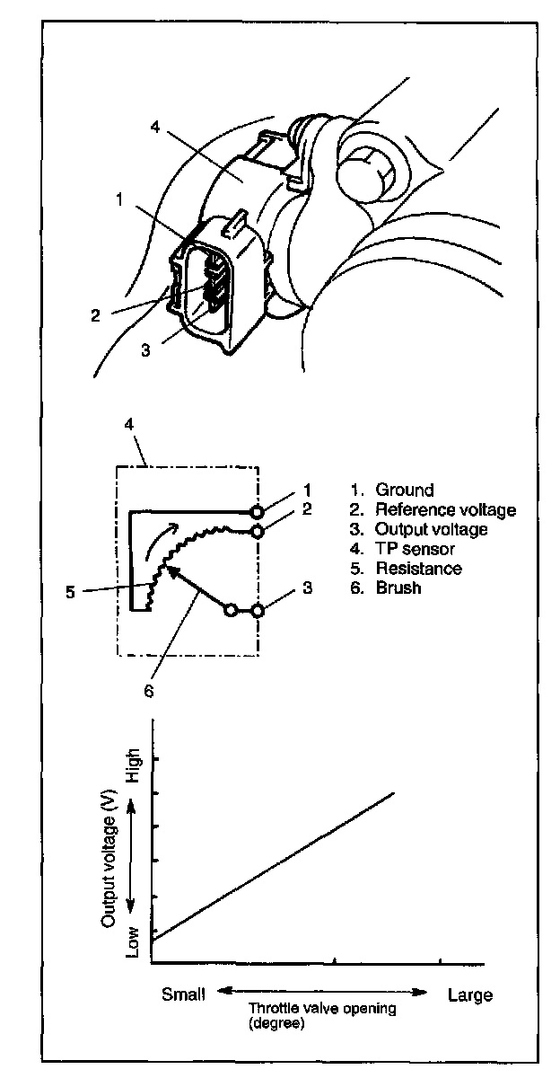 The throttle opening is detected by the potentiometer as follows. A 5-volt reference voltage is applied to the sensor from ECM (PCM) and as its brush moves over the print resistance according to the throttle valve opening, the output voltage varies accordingly.
