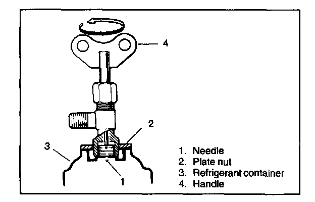 1. Retract needle and remove refrigerant container tap valve by loosening its plate nut.