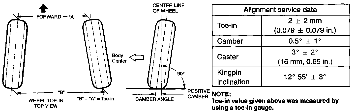 Front alignment refers to the angular relationship between the front wheels, the front suspension attaching parts and the ground. Generally, the only adjustment required for front alignment is toe setting. Camber and caster can't be adjusted. Therefore, should camber or caster be out of specification due to the damage caused by hazardous road conditions or collision, whether the damage is in body or in suspension should be determined. If the body is damaged, it should be repaired and if suspension is damaged, it should be replaced.