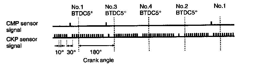 The sensor is mounted on the sensor case (distributorless ignition case) on the camshaft left side. The signal rotor is press-fitted onto the camshaft. As the sensor has a built-in hall element (element which generates voltage from changes in the magnetic flux) and a waveform forming circuit, it converts changes in the magnetic flux caused by rotation of the signal rotor into electric pulse signals. Using this signal and the signal from the CKP sensor, ECM (PCM) identifies the cylinder whose piston is in the compression stroke.