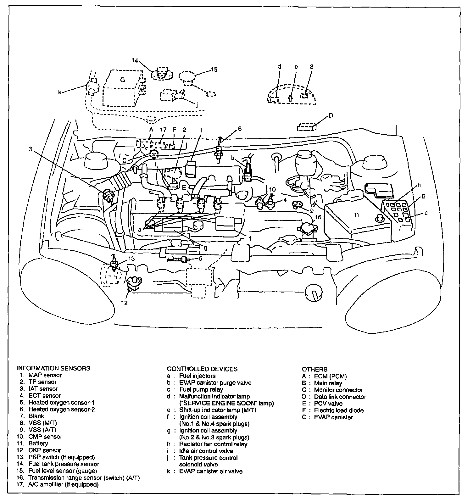 The electronic control system consists of 1) various sensors which detect the state of engine and driving conditions, 2) ECM (PCM) which controls various devices according to the signals from the sensors and 3) various controlled devices.