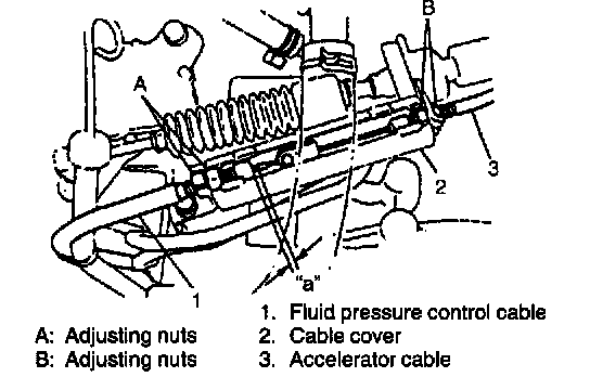 ADJUSTMENT1. With cable cover removed, adjust clearance "a" to specification by turning nuts B. Nuts A can be used for this adjustment if necessary.