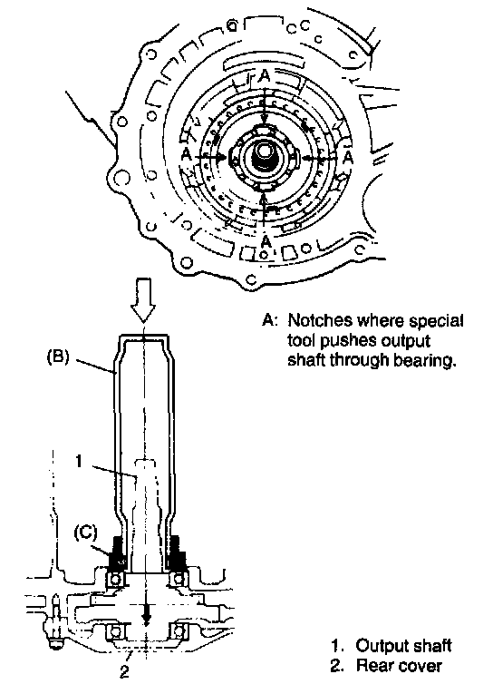8. Using special tools (Output shaft remover and Bearing remover handle), push output shaft against rear cover side.