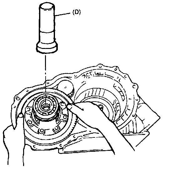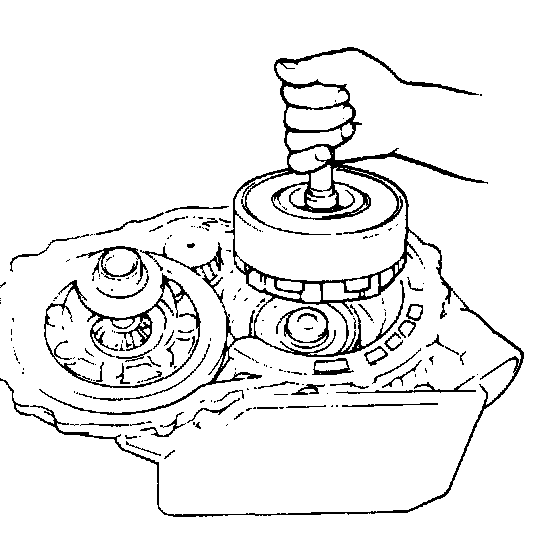 22. Push in sun gear assembly while engaging it with rear planetary gear. Be careful not to damage bushing inside sun gear. After installing sun gear, check thrust washers for proper installation by moving sun gear up and down lightly with finger. If sun gear makes clear sound like "Click" when moved up and down, washers are installed in place. But if no sound or thick one is heard, it is possible that they are out of places. In such case, remove sun gear and check.