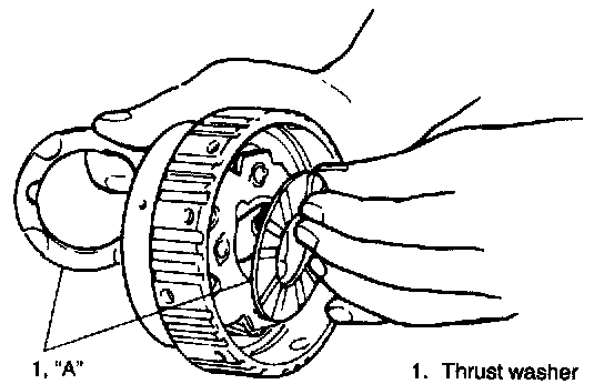 After installing rear planetary gear, check thrust washers and races for proper installation by moving rear planetary gear up and down lightly by hand. If gear assembly makes clear sound like "Click" when moved up and down, washers and races are installed in place. But if no sound or thick one is heard, it is possible that they are out of place.