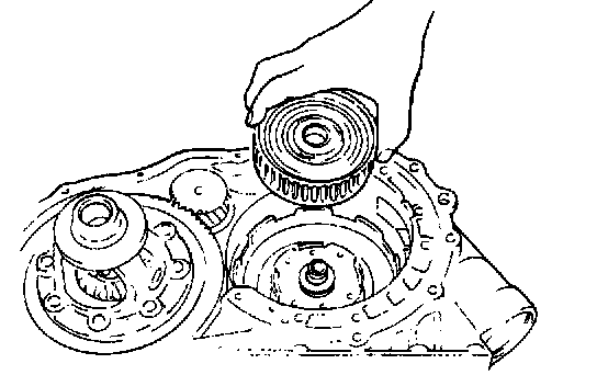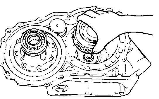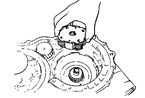 24. Install front planetary gear assembly while turning it back and forth. After installing front planetary gear assembly, check bearing and race installed in step 23 for proper installation by moving planetary gear assembly up and down lightly with finger. If planetary gear makes clear sound like "Click" when moved up and down, bearing and race are installed in place. But if no sound or thick one is heard, it is possible that they are out of place. In such case, remove planetary gear assembly and check.
