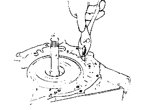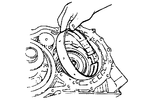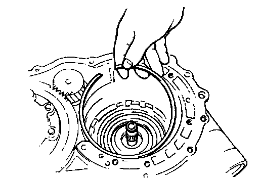 20. Push one-way clutch race snap ring into place by hand. Visually check to make sure that ring is fully seated. Also, make sure that ends of snap ring are between lugs.