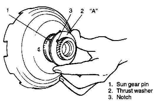 21. Install sun gear pin and thrust washer on sun gear assembly. Apply grease to thrust washer so that it will not fall off. Check to make sure that pin is fitted in thrust washer notch.
