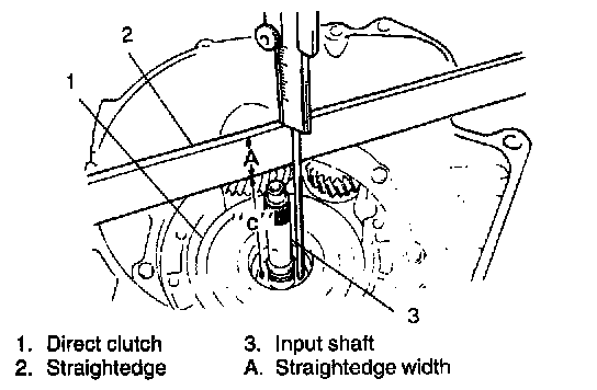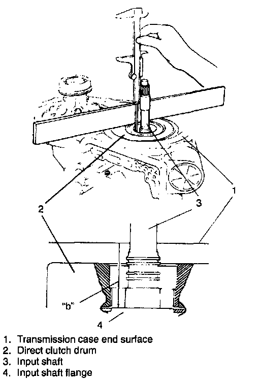 After installing input shaft, check to make sure that each component is installed properly according to following description. Place straightedge on transmission case end surface and measure the distance "b" by using vernier. For the distance "b", subtract the width of straightedge from vernier reading. If measured distance "b" is within following specification, it means that component parts other than direct clutch are installed properly.