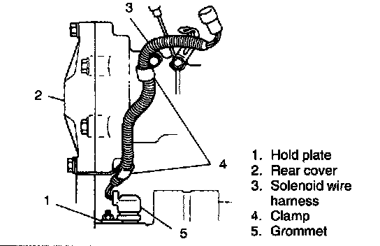 c. Install solenoid wire clamps to rear cover and case. Secure harness with them.