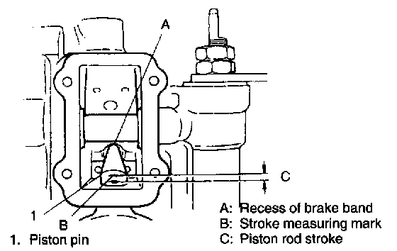 Looking through second brake band cover hole, check that second brake piston rod end is aligned with the center of recess in brake band as shown in below figure. If rod end contacts outside of brake band recess, pull up second brake band by inserting thin wire in brake band fitting so that band recess aligns with rod end properly.