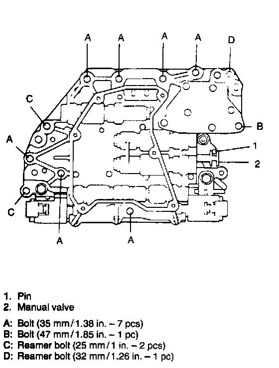 51. Install valve body assembly to case. Align manual valve with pin on manual shift lever and lower valve body into place. Install 11 bolts in lower valve body. Each bolt length is given in figure. First, tighten 3 reamer bolts (positioning bolts) C and D lightly. Then tighten all bolts in diagonal order.