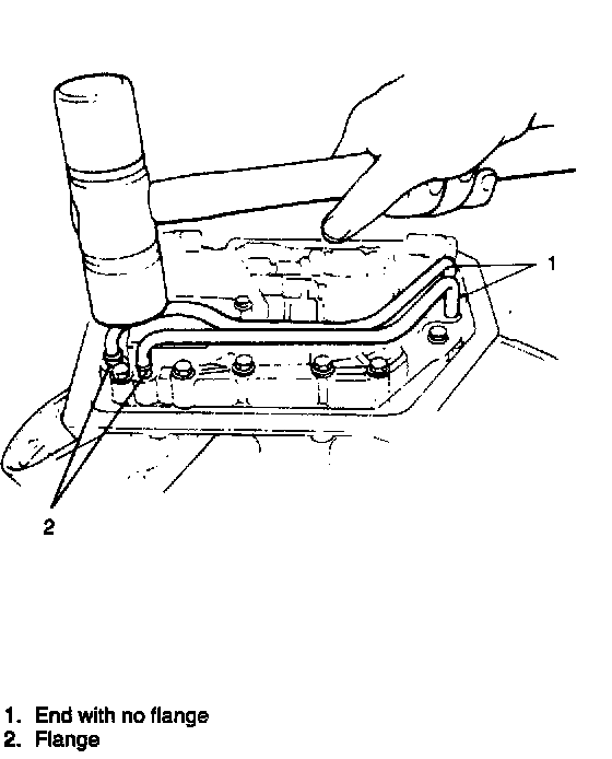 53. Install oil tubes to lower valve body. First put the end of oil tube without flange about 2 mm (0.08 inch) into lower valve body, then insert the one with flange and push both ends of tube by hand. Next, tap them in lightly with a plastic hammer as far as flange position.