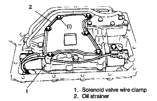 55. Install oil strainer and solenoid valve wire clamp. Clamp solenoid valve wire by fastening solenoid valve wire clamp with oil strainer bolt in the position as shown in figure.