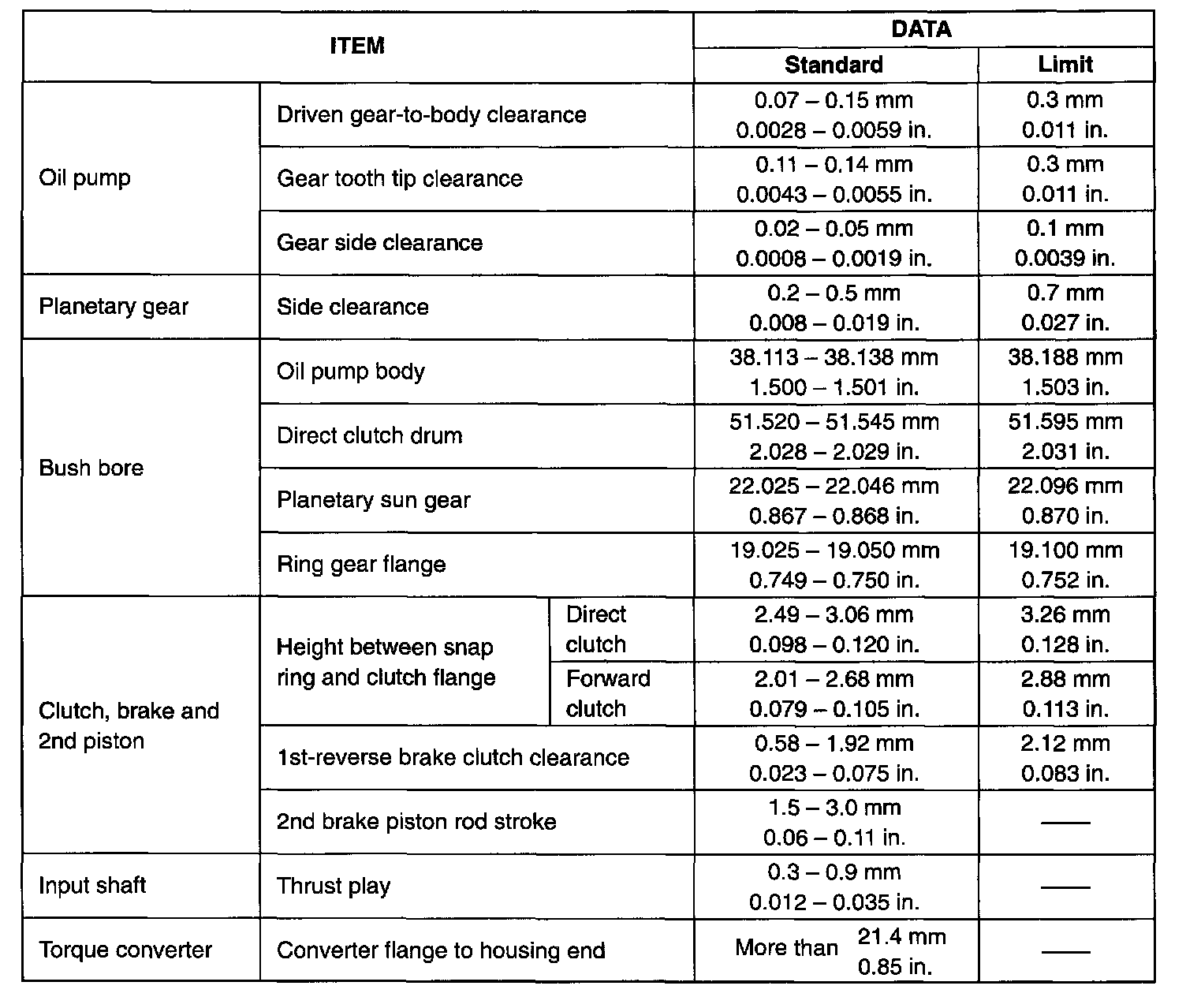 Input shaft thrust play: 0.3 - 0.9 mm (0.012 - 0.035 inch)