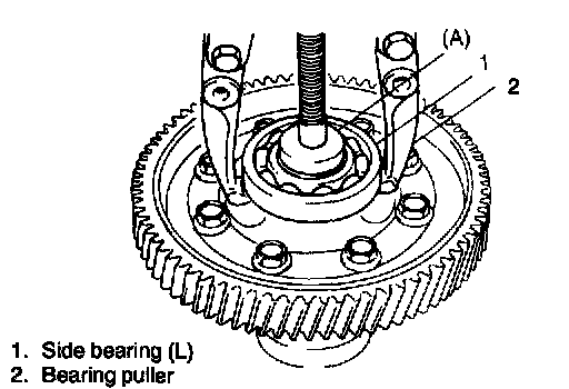 1. Remove diff. side bearing (L). Use special tool and puller for its removal.