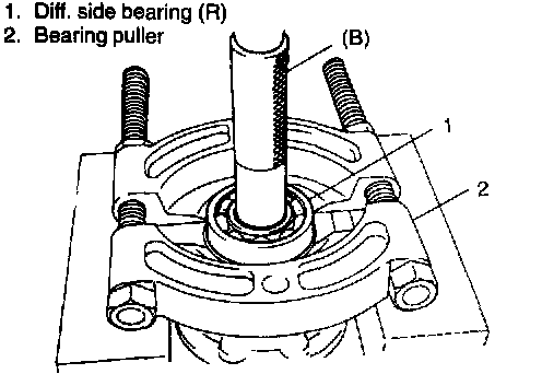 3. Remove diff. side bearing (R). Drive it out by using special tool, bearing puller and press.
