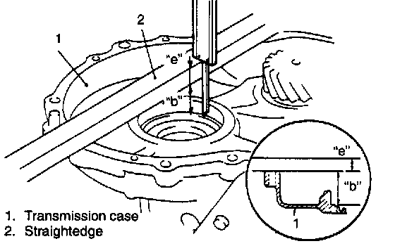 2. In the same manner as the above 1), measure dimension "b" of transmission case (from mating surface to bearing bore bottom).