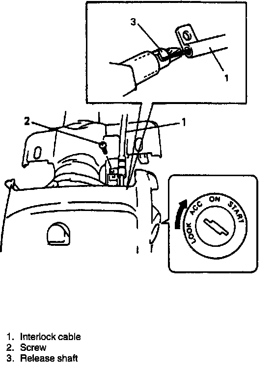 4. Remove interlock cable clamp screw located at ignition switch and disconnect interlock cable from release shaft with ignition switch turned to "ACC" position.