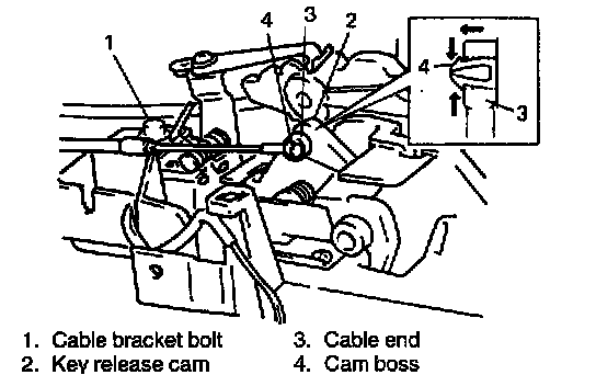 6. Remove cable bracket bolt and detach cable end from key release cam while pressing claws of release cam boss. At this time, be careful not to cause damage to its claws.