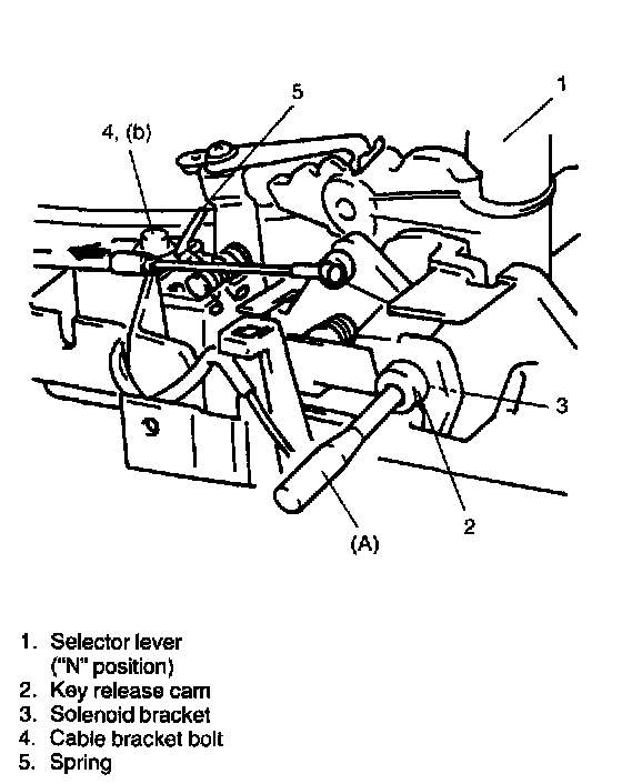 7. Remove special tool and turn ignition switch to "ACC" position. With selector lever set at "P" position and lock plate of shift lock solenoid manually moved toward front side of vehicle, check that key release cam moves smoothly by operating knob button of selector lever.