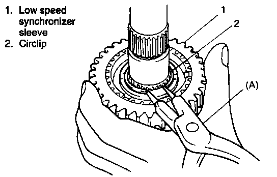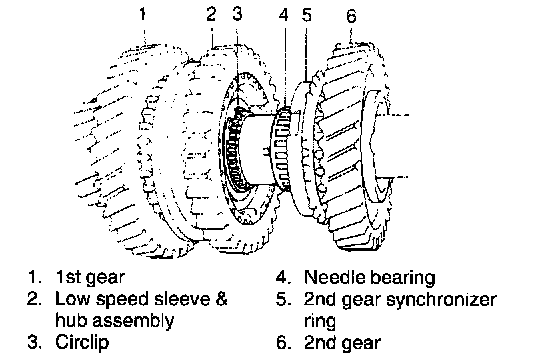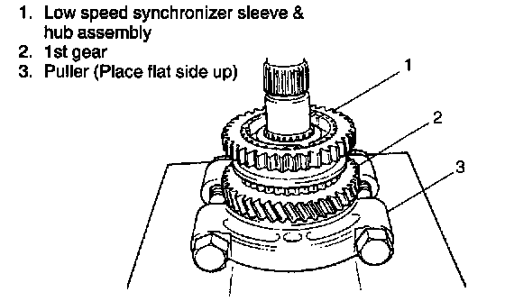 5. Apply puller to 1st gear and drive out low speed synchronizer sleeve & hub assembly with gear by using press.