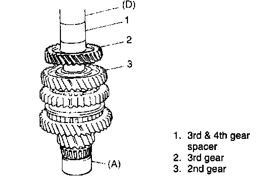 NOTE: It is recommended to press-fit spacer and 3rd gear first, and then 4th gear later separately so that countershaft will not be compressed excessively.