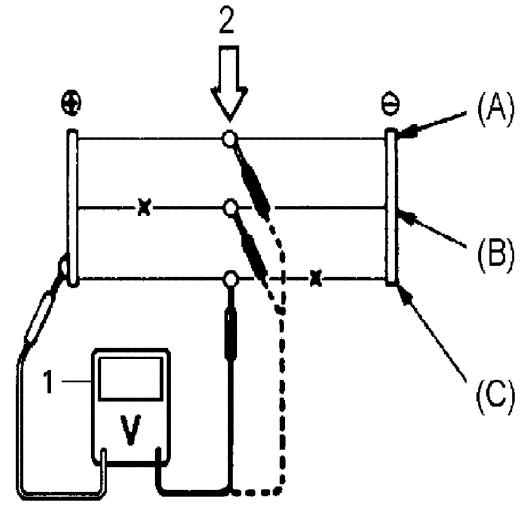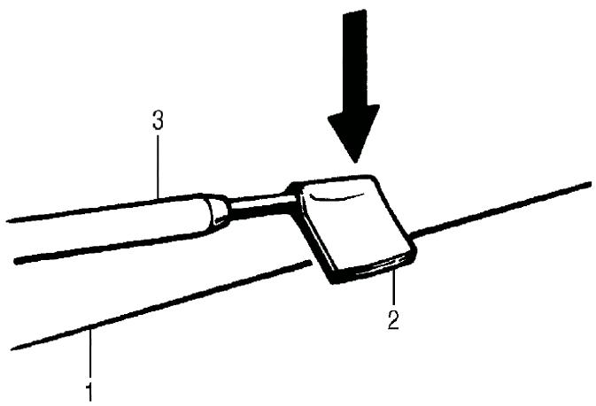 - When measuring wire voltage, use a tester with negative probe (3) wrapped with a tin foil (2) which should be held down on wire (1) by finger pressure.
